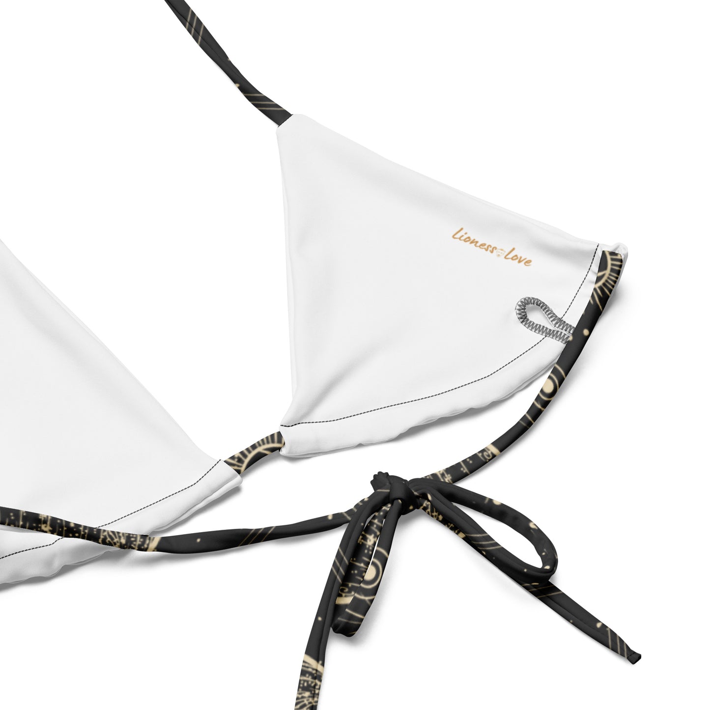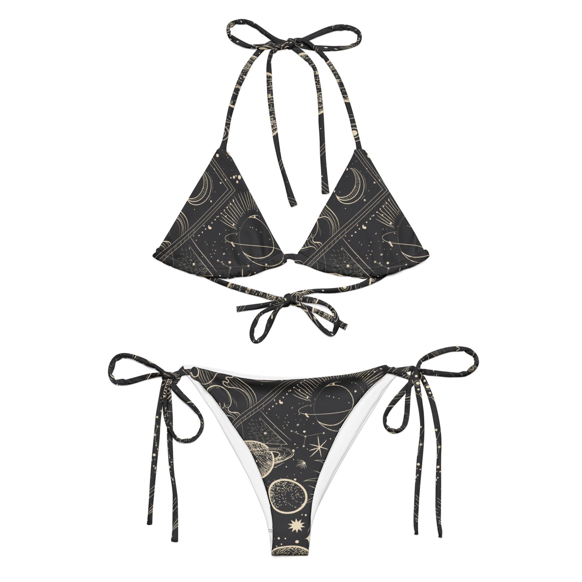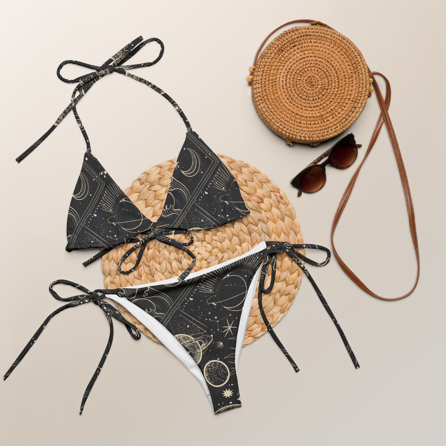 Elevate your swimwear collection with the Lilith Celestial String Bikini Set, designed for women who love both style and intention. Crafted from soft recycled polyester with UPF 50+ protection, this dreamy celestial bikini combines eco-conscious design with a flattering, adjustable fit. Double-layered for comfort and coverage, it features removable padding and fully customizable ties, allowing you to style it your way — from halter to classic triangle or criss-cross cosmic chic.