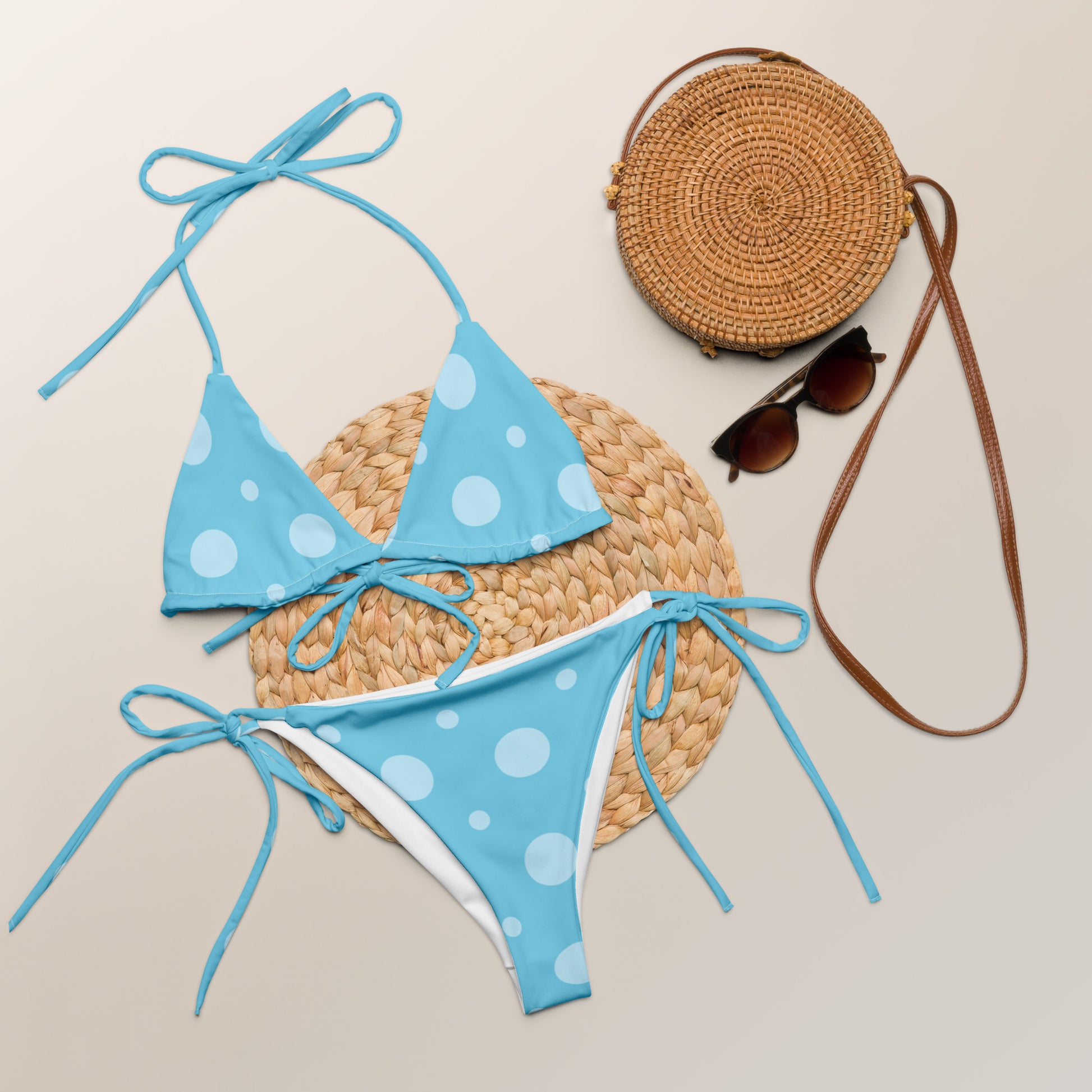 Elevate Your Summer Style with our Stylish Summertime Polka Dots String Bikini Set! Crafted from soft recycled polyester, this ensemble offers both comfort and sustainability. Featuring double-layering and UPF 50+ protection, it ensures you stay stylish while staying protected from the sun's rays. Customize the straps to your liking and dive into the season in confidence!
