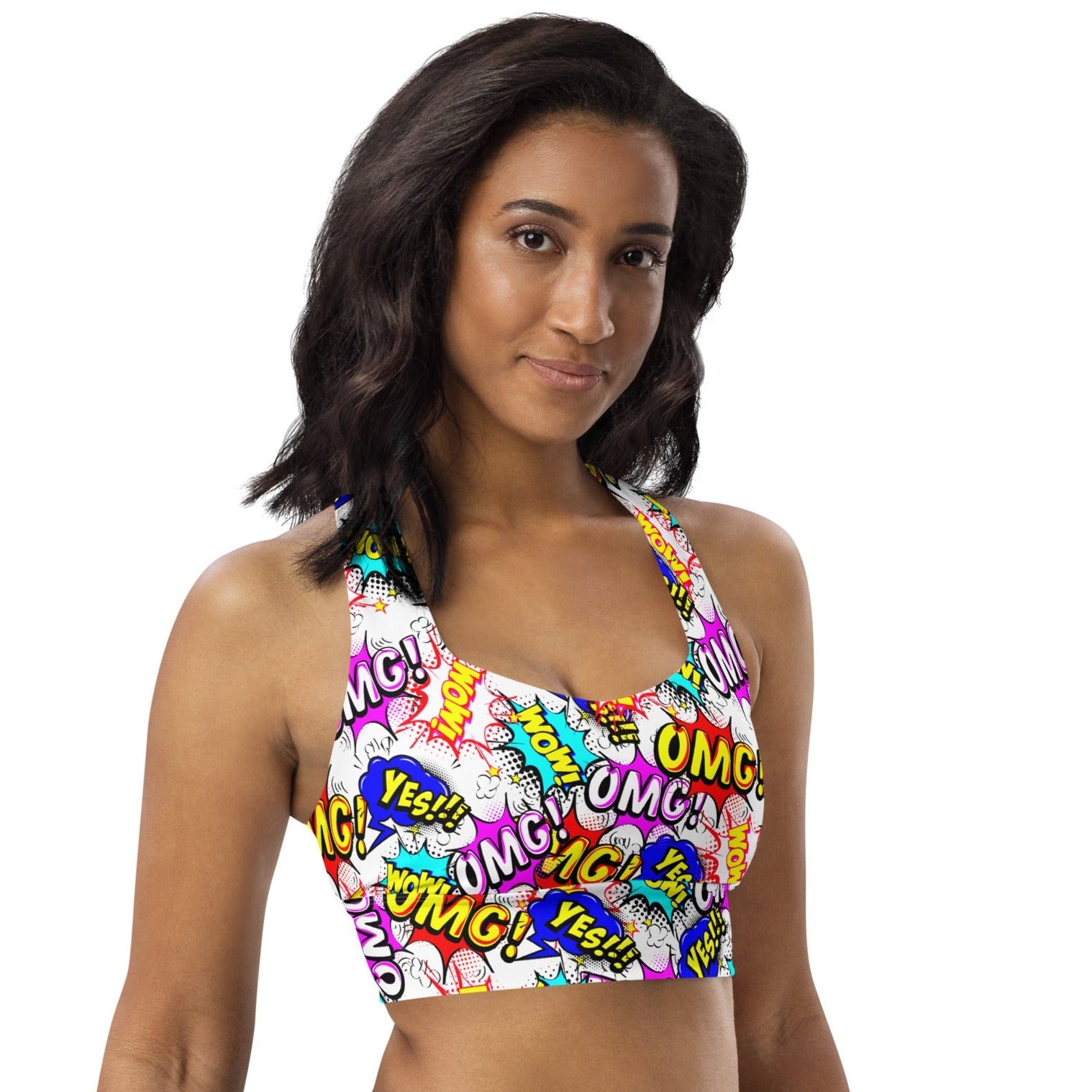 Bring explosive energy to your activewear with the Cassie Kaboom Longline Sports Bra, designed for high-impact support with bold retro comic-book flair. Featuring a playful “OMG!” pop-art burst, this bra is built to perform — and designed to turn heads.