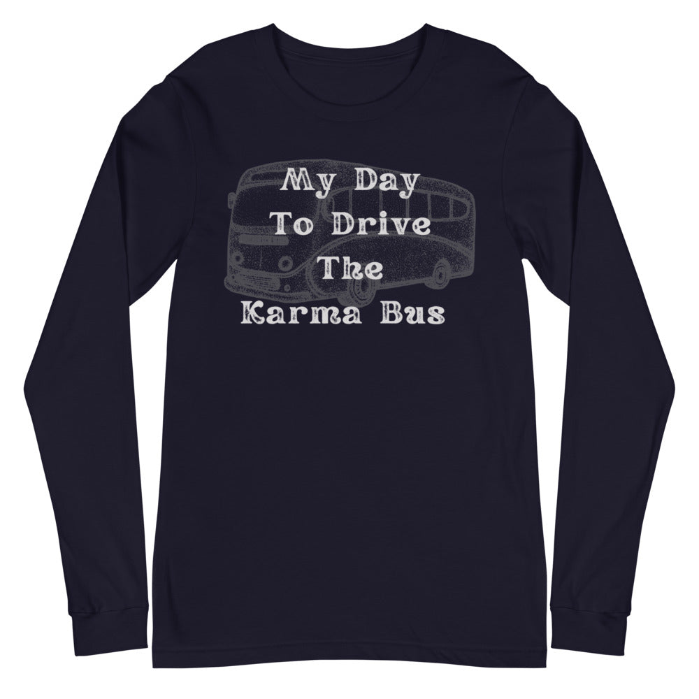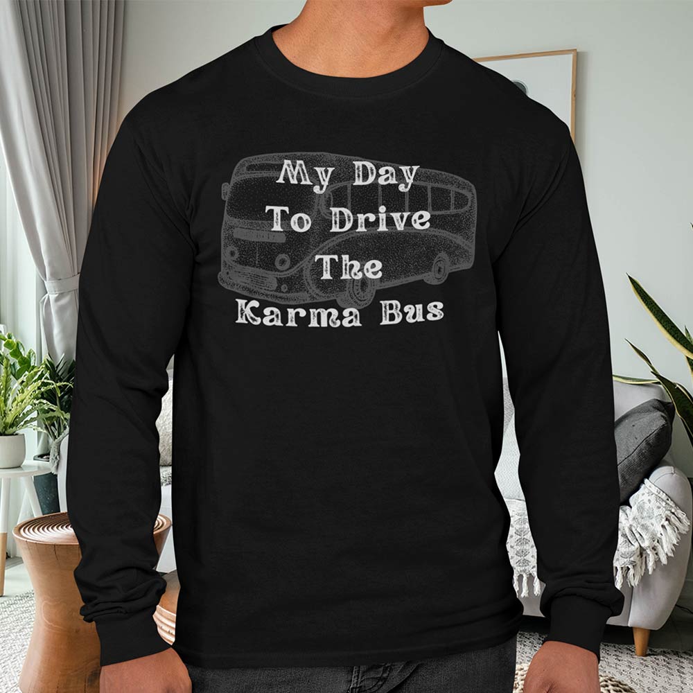 Enrich your wardrobe with a versatile long sleeve my day to drive the karma bus tee. For a casual look, combine it with your favorite jeans, and layer it with a button-up shirt, a zip-up hoodie, or a snazzy jacket. Dress it up with formal trousers or chinos to achieve a more professional look.