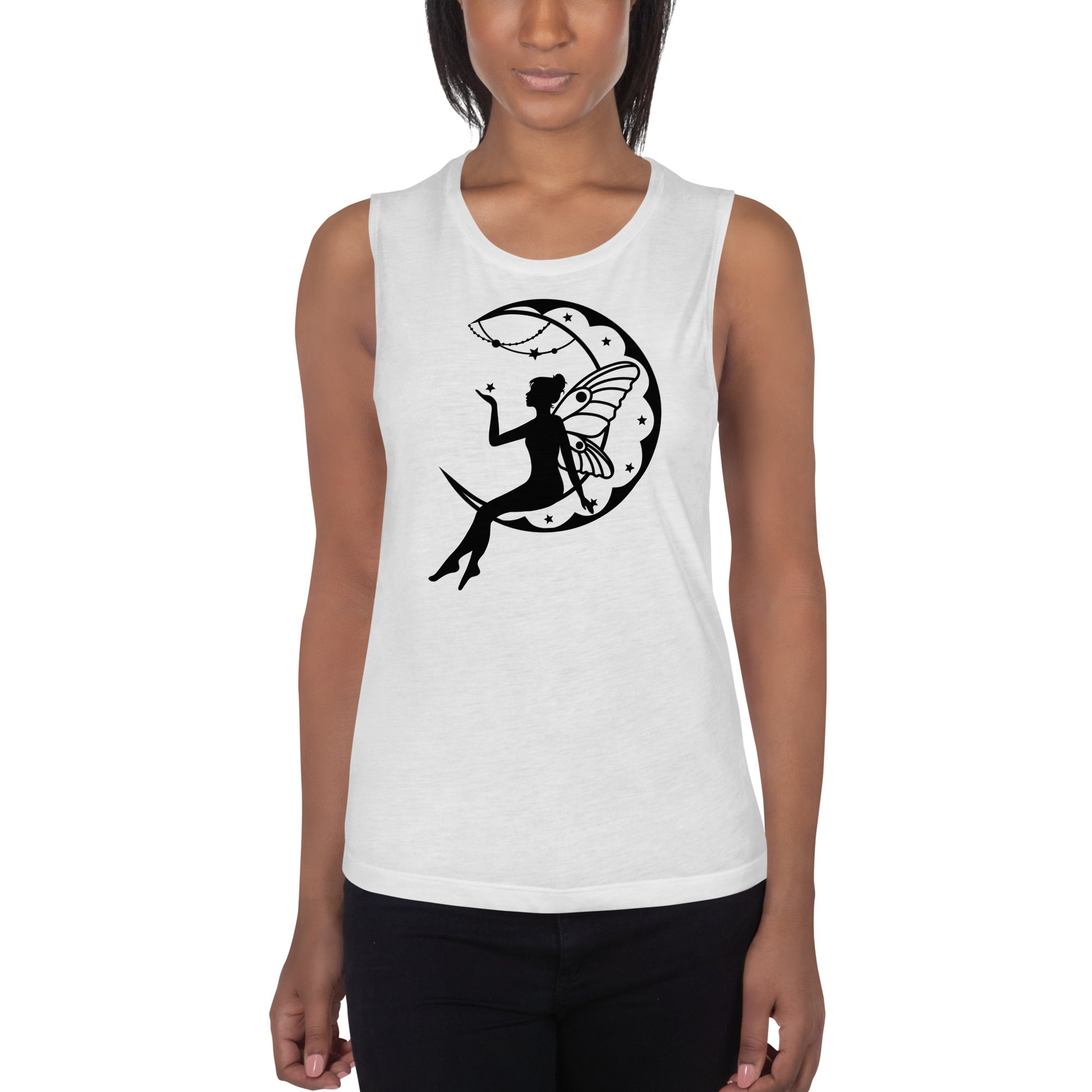 Channel your inner magic with this Fairy Moon Muscle Tank, where celestial vibes meet feminine strength. Featuring a dreamy design of a fairy resting gracefully in a crescent moon, this mystical women’s muscle tee is perfect for anyone drawn to the magic of the night sky.