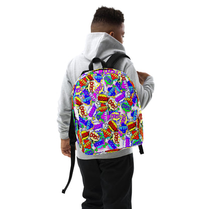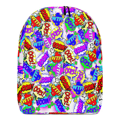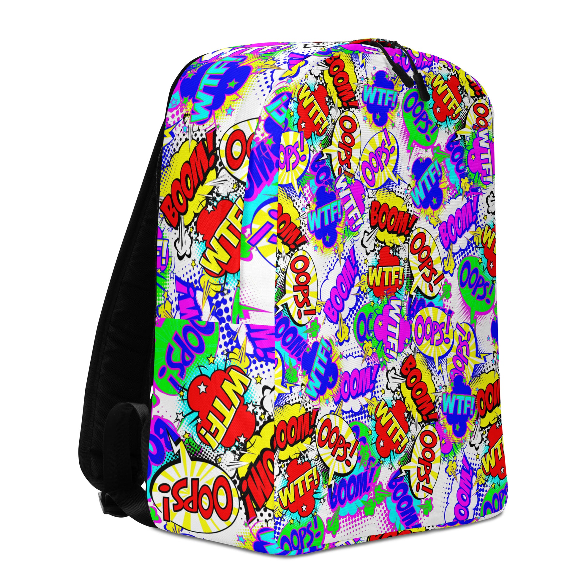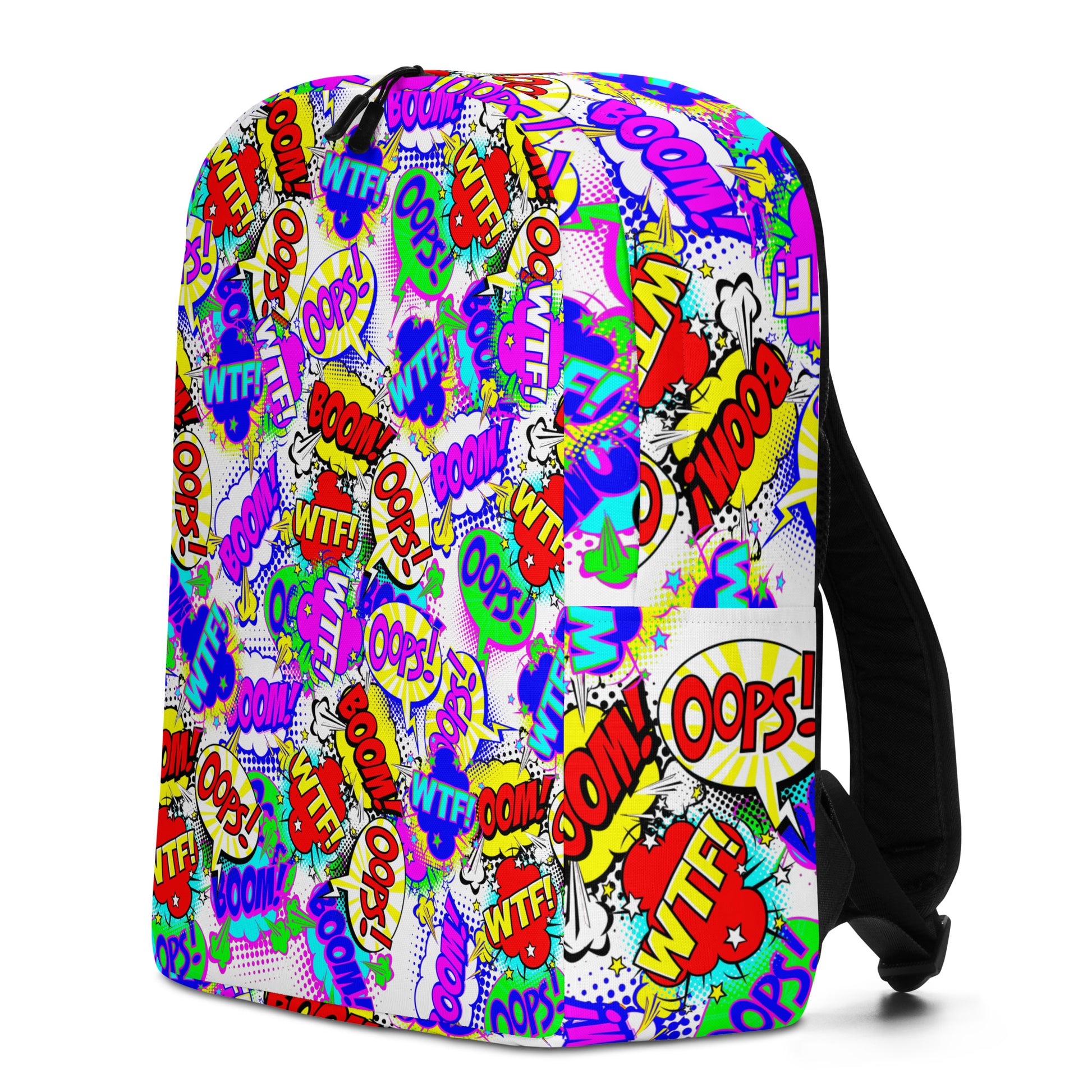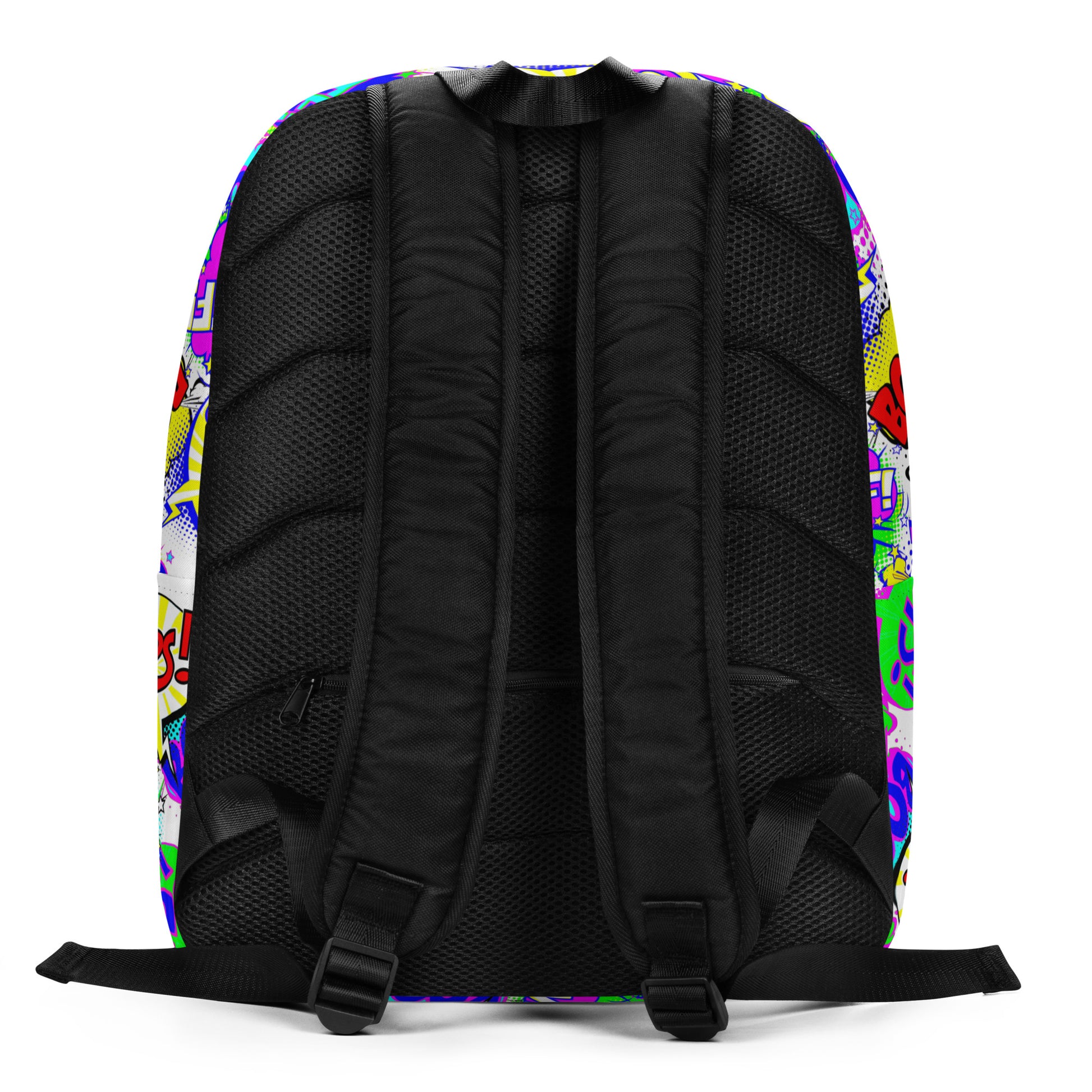Made from durable, water-resistant polyester, it features a spacious main compartment with a padded laptop pocket, plus a hidden zippered back pocket for valuables. Soft mesh padding on the back and ergonomic straps ensure all-day comfort, while the eye-catching comic print adds playful throwback energy to any outfit.
