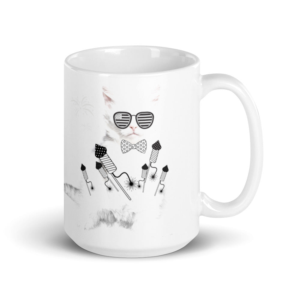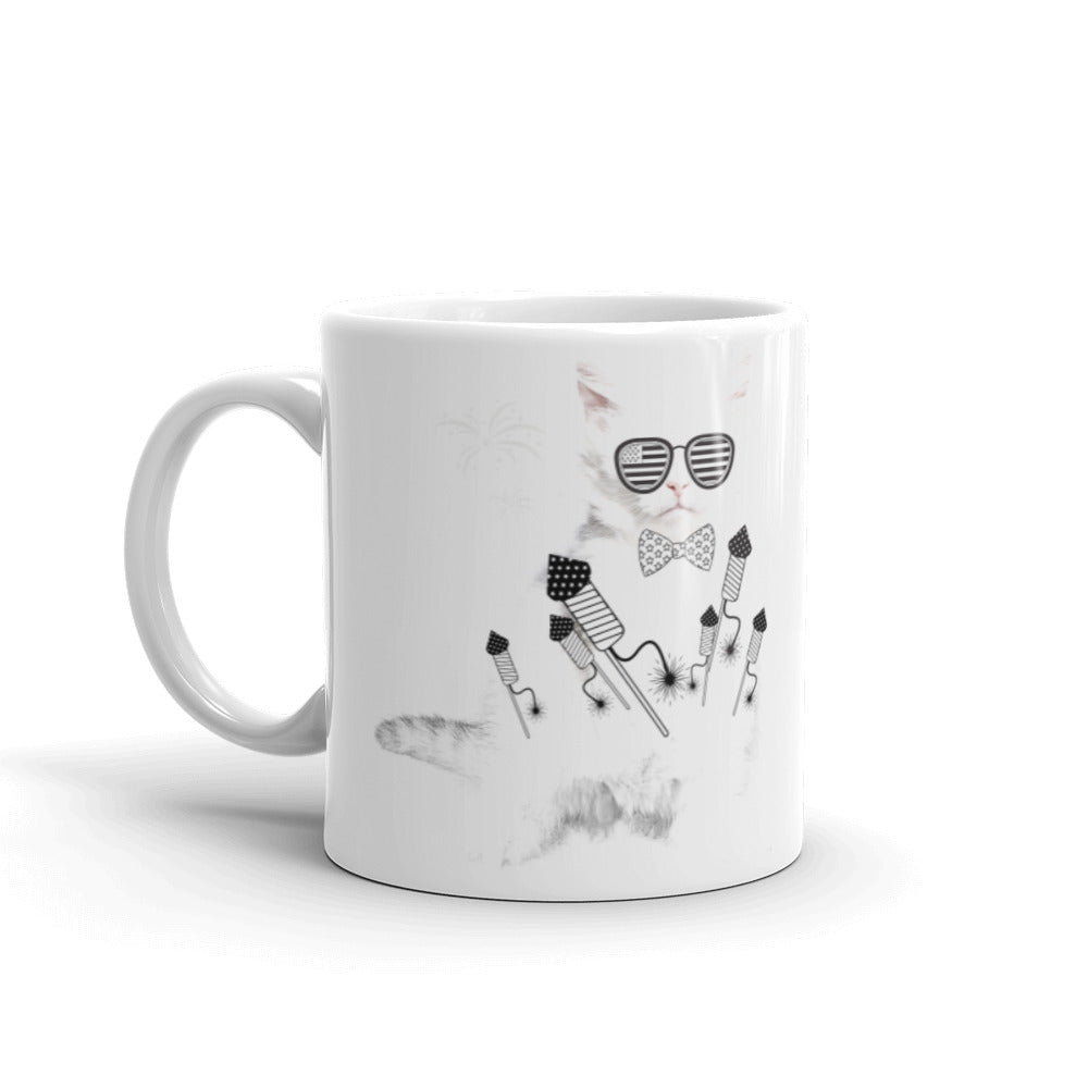 Whether you're drinking your morning coffee, evening tea, hot cocoa or something in between – this Funny cat with fireworks mug's for you and makes a great gift for cat lovers! It's sturdy and glossy with a vivid print that'll withstand the microwave and dishwasher.