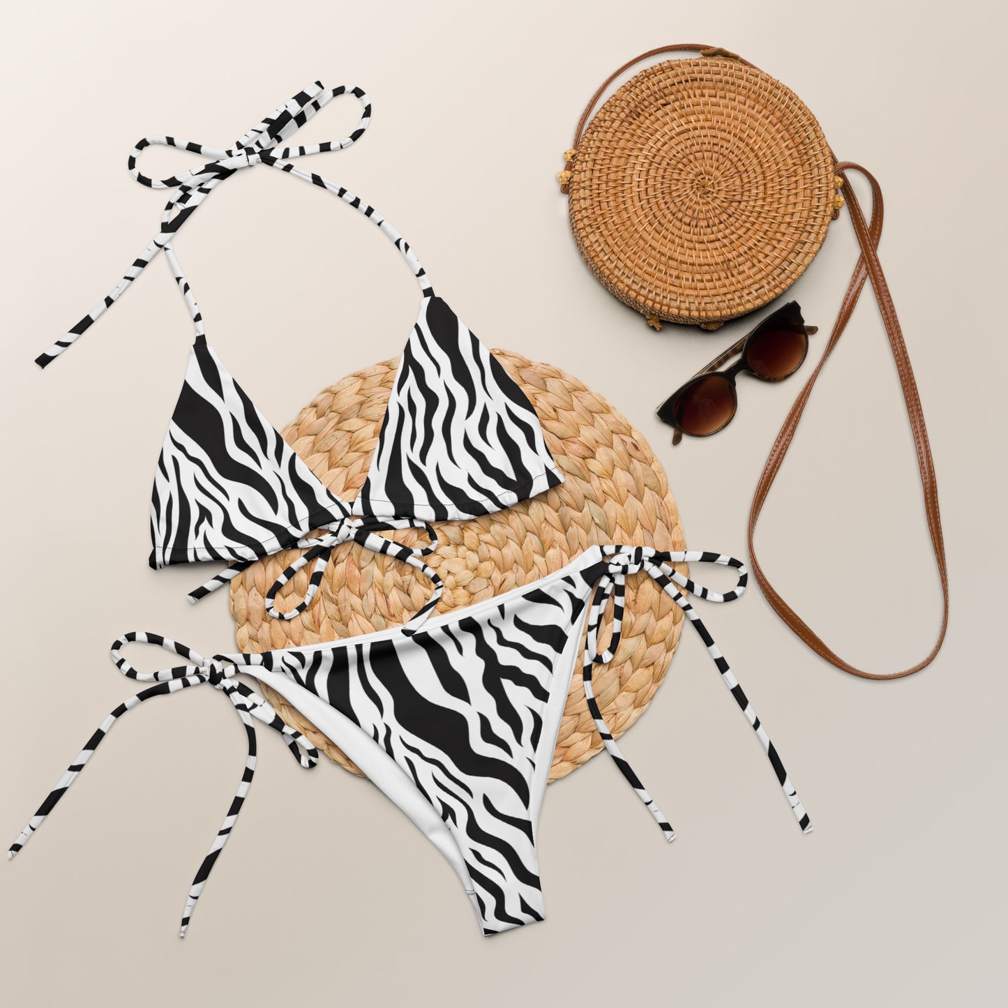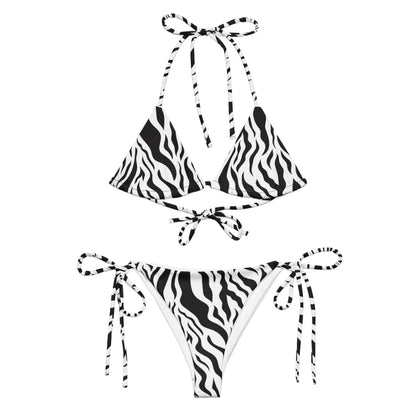 Unleash Your Wild Side with the Zebra Print String Bikini Set. Crafted from Soft Recycled Polyester, featuring Double-Layering and UPF 50+ Protection. Customize the Straps for Your Perfect Fit and Make a Splash in Style!