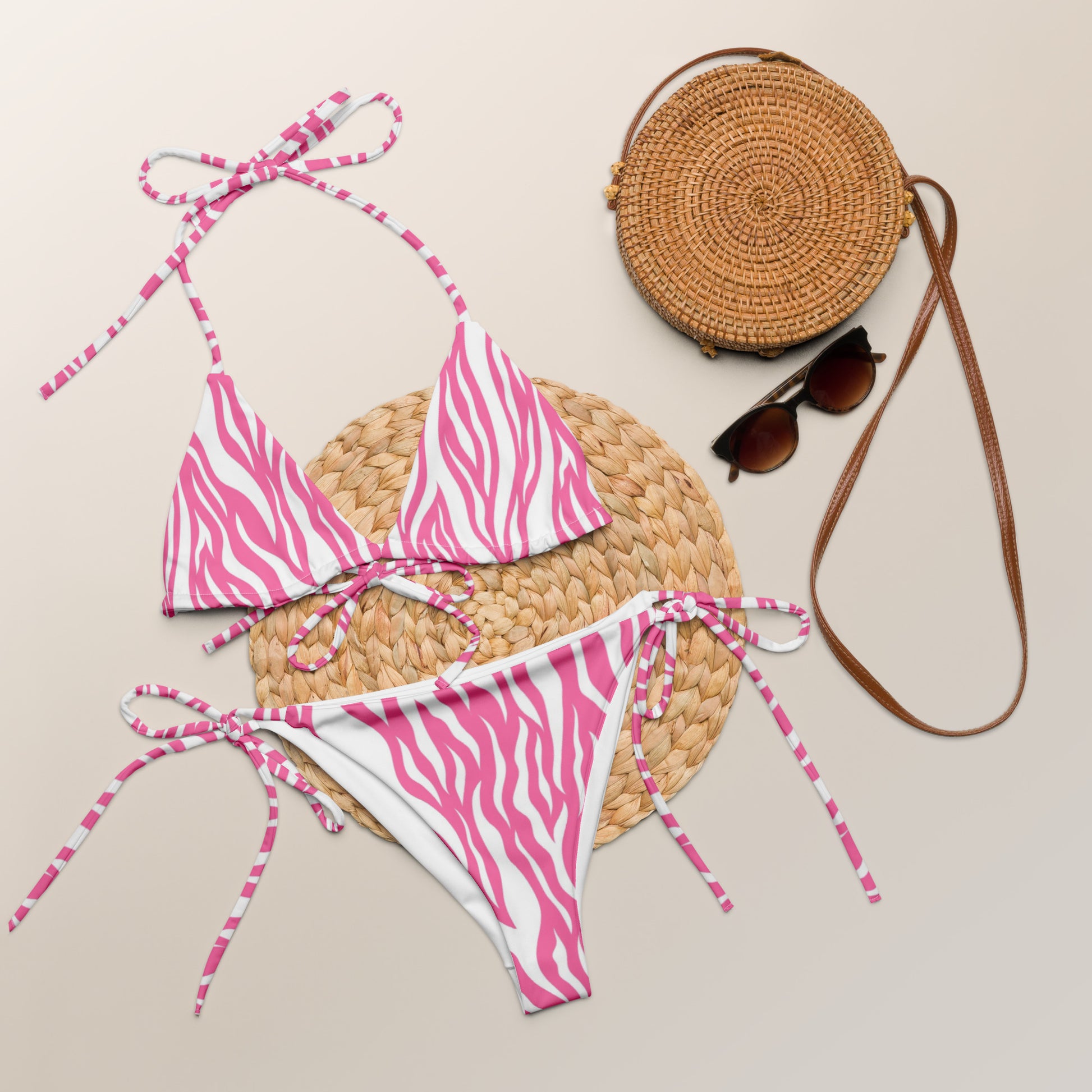 Vacation never looked so good! Make a splash in the Elle Pink Zebra String Bikini Set by Lioness Love. Designed for bold beach days and confident poolside style, this vibrant set is crafted from soft, stretchy recycled polyester with UPF 50+ protection to keep you comfortable and sun-safe. The adjustable string straps allow endless styling options while ensuring your perfect fit. The top features removable padding for customizable comfort, and sizes up to 6XL make this bikini a feel-good choice for every body. Whether you're lounging, swimming, or soaking up tropical vibes, this zesty pink zebra print brings fierce energy to every adventure. Rinse thoroughly after each use to extend the life of your bikini and keep the colors bright.